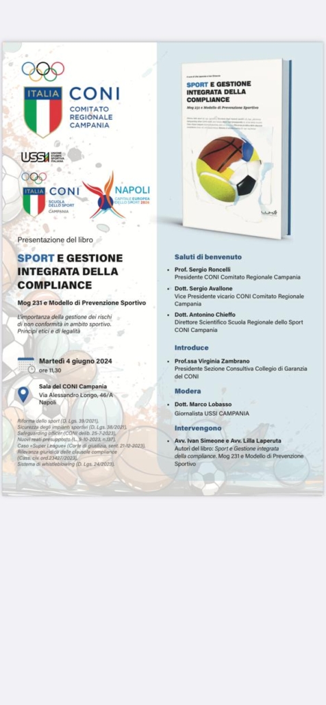 Nel corso del convegno sarà presentato il volume Sport e gestione integrata della compliance curato dagli avvocati Lilla Laperuta e Ivan Simeone.